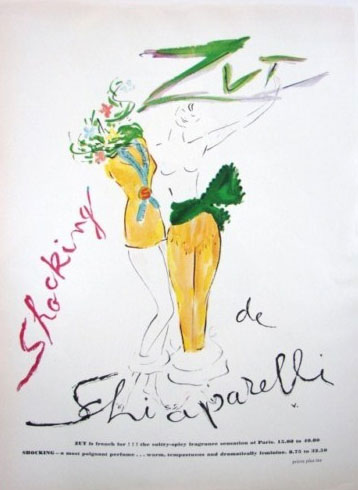 Perfume advertisements for Zut by Elsa Schiaparelli by fashion illustrator, Marcel Vertes. Vertes and Schiaparelli worked together on the 1952 movie Moulin Rouge.